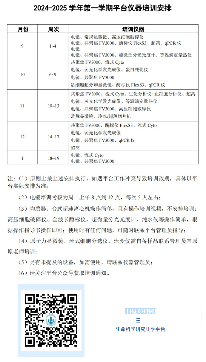 平台拟于2024~2025学年第一学期继续定期举办仪器培训学习,包括技术讲座和仪器上机培训及考核,欢迎大家关注平台微信公众号获取培训通知!