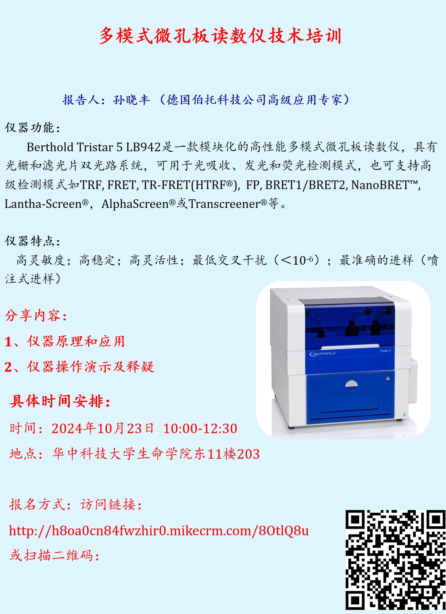 备注:科研共享平台新购置的仪器Berthold Tristar 5 LB942多模式微孔板读数仪将安装于东11楼203,本次为厂家培训,欢迎各位用户踊跃报名!