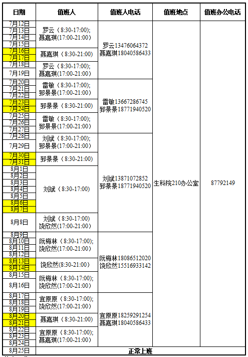 1、暑假值班时间:上午8:30—11:30,下午3:00—5:00,晚上7:00-9:00