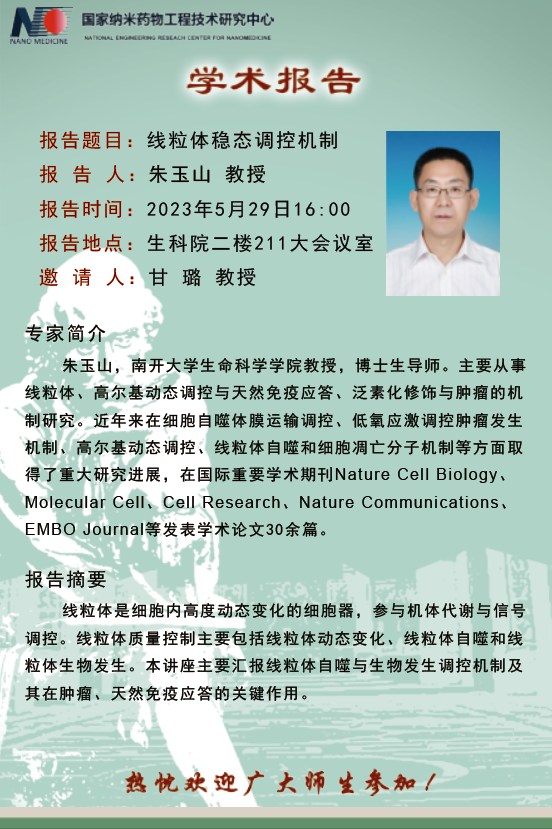 朱玉山,南开老员工命科学公司教授,博士生导师。主要从事线粒体、高尔基动态调控与天然免疫应答、泛素化修饰与肿瘤的机制研究。近年来在细胞自噬体膜运输调控、低氧应激调控肿瘤发生机制、高尔基动态调控、线粒体自噬和细胞凋亡分子机制等方面取得了重大研究进展,在国际重要学术期刊Nature Cell Biology、Molecular Cell、Cell Research、Nature Communications、EMBO Journal等发表学术论文30余篇。