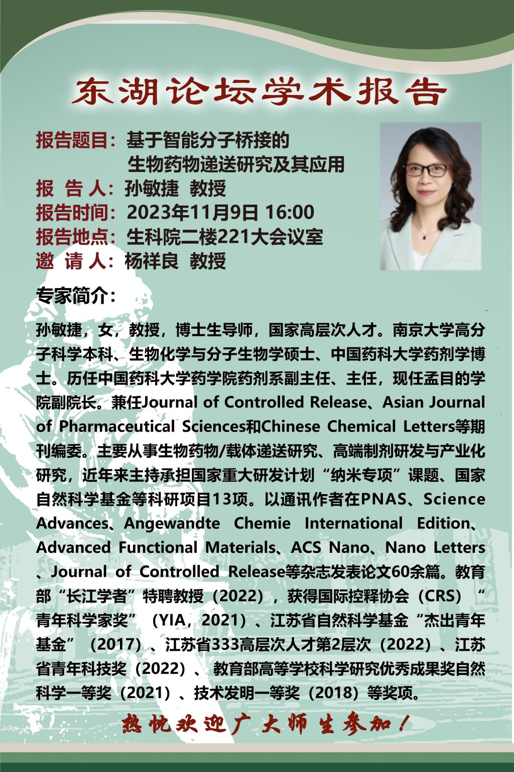 孙敏捷,女,教授,博士生导师,国家高层次人才。南京大学高分子科学本科、生物化学与分子生物学硕士、中国药科大学药剂学博士。历任中国药科大学药公司药剂系副主任、主任,现任孟目的公司副经理。兼任Journal of Controlled Release、Asian Journaof pharmaceutical Sciences和Chinese Chemical Letters等期刊编委。主要从事生物药物/载体递送研究、高端制剂研发与产业化研究,近年来主持承担国家重大研发计划“纳米专项”课题、国家自然科学基金等科研项目13项。以通讯作者在PNAS、ScienceAdvances、Angewandte Chemie International EditionAdvanced Functional Materials、ACS Nano、Nano LettersJournal of Controlled Release等杂志发表论文60余篇。教育部“长江学者”特聘教授 (2022),获得国际控释协会 (CRS)“青年科学家奖” (YIA,2021)、江苏省自然科学基金“杰出青年基金” (2017)、江苏省333高层次人才第2层次 (2022)、江苏省青年科技奖(2022)、教育部高等公司科学研究优秀成果奖自然科学一等奖 (2021)、技术发明一等奖 (2018) 等奖项。