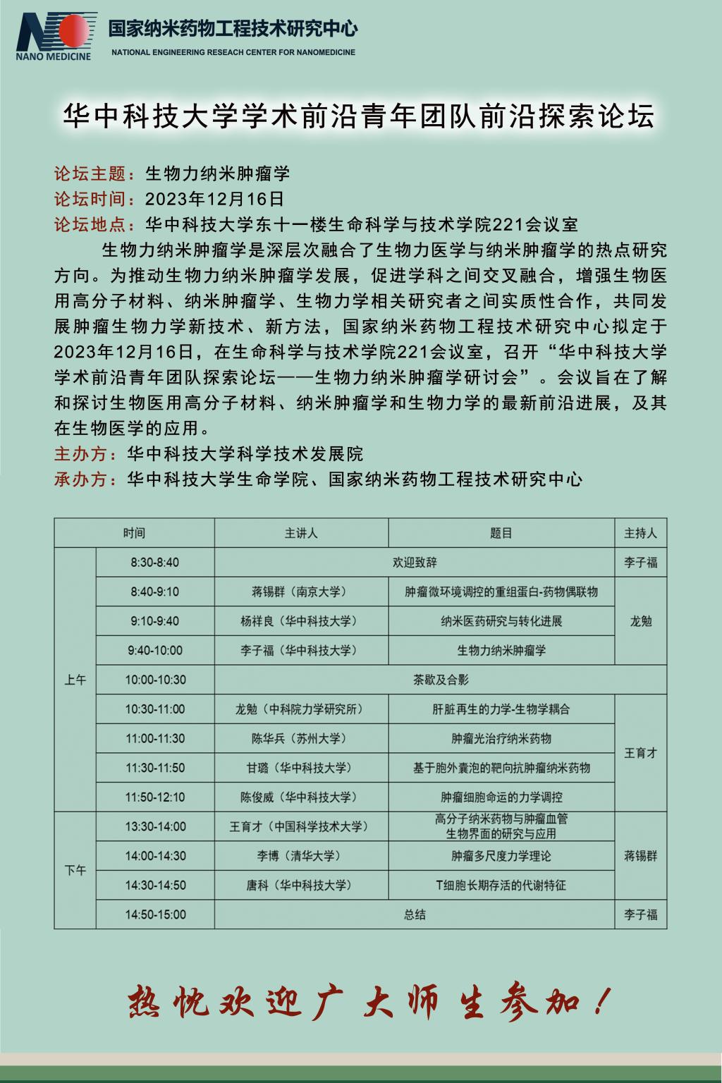 生物力纳米肿瘤学是深层次融合了生物力医学与纳米肿瘤学的热点研究方向。为推动生物力纳米肿瘤学发展,促进学科之间交叉融合,增强生物医用高分子材料、纳米肿瘤学、生物力学相关研究者之间实质性合作,共同发展肿瘤生物力学新技术、新方法,国家纳米药物工程技术研究中心拟定于2023年12月16日,在221会议室,召开“必威西汉姆联官网学术前沿青年团队探索论坛——生物力纳米肿瘤学研讨会”。会议旨在了解和探讨生物医用高分子材料、纳米肿瘤学和生物力学的最新前沿进展,及其在生物医学的应用。欢迎感兴趣的老师及同学参会!