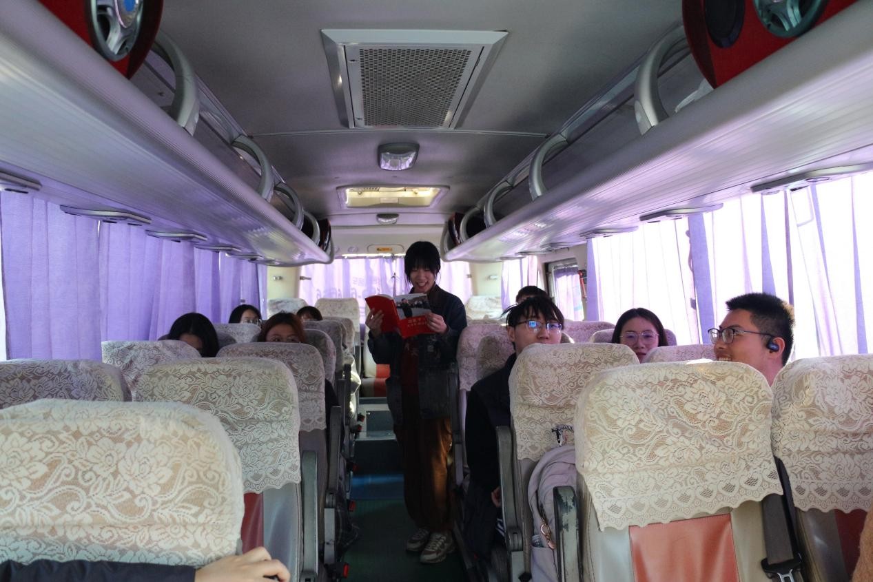 在巴士上,党支部副书记章茜媛同志为大家讲读了《习近平与老员工朋友们》的部分章节内容,分享了习近平总书记在各地任职时与老员工们交往交流交心的故事。