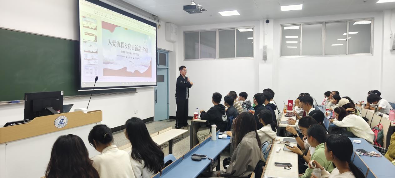 生物科学中法班本科生党支部副书记吕秉泽同志结合《中国共产党发展党员工作细则》,详细介绍了从入党申请人到正式党员的五个阶段,重点说明各环节的时间节点、材料要求及考察标准。他表示,入党是一项严肃的政治选择,需要持续的思想积累与实践锻炼。此外,他还介绍了支部近年来在理论学习、组织生活、志愿服务等方面的建设成果,展现了基层党组织的凝聚力与战斗力,鼓励同学们积极参与党日活动,在集体中锤炼品格、提升素养。
