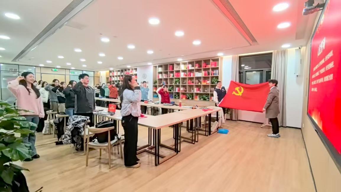 集体重温入党誓词,坚定理想信念根基。预备党员转正支部大会环节,9名拟转正的预备党员依次汇报了自己在预备期内的成长与感悟。同志们结合自身经历,分享了在专业学习与科研探索中取得的实质性进步。大家纷纷表示,这一年不仅是考察期,更是思想淬炼与能力提升的关键阶段。通过系统的理论学习和深入的实践锻炼,进一步明确了身为党员的责任与担当,更加坚定了将个人理想融入党和国家事业、在未来岗位上贡献青春力量的决心。在完成转正程序后,支部组织全体党员重温入党誓词。在支部青年委员周钰的带领下,全体党员面向党旗,举起右拳,庄严宣誓。