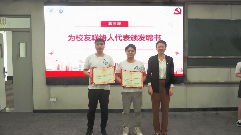 员工工作及对外联络办公室副主任高珊老师为员工联络人代表王拓和李天翔颁发聘书。鼓励同学们在新征程上奋勇向前,同时发挥好员工与母校之间的桥梁纽带作用,讲好华中大故事。