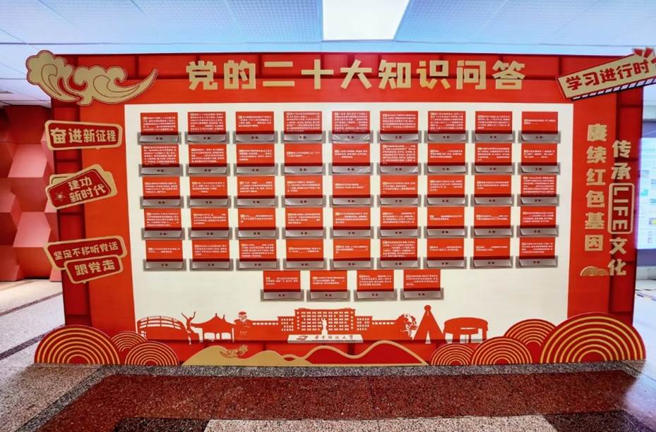 沐浴红色精神,拾级而上,二楼以“深入学习宣传贯彻党的二十大精神”为主题。设有“党的二十大知识竞答”、“数读党的二十大报告”、“标杆院系这五年”三个部分,“党的二十大知识竞答”通过问答的形式学习党的二十大精神,让参展者在思考中悟精神,激励公司师生奋进新征程、建功新时代。“数读党的二十大报告”板块以节选党的二十大报告原文的形式,带领参展者深入理解中国式现代化、乡村振兴、区域协调发展、高水平对外开放、新领域新赛道、高水平社会主义市场经济体制、现代化产业体系、共同富裕、和谐共生等9个重要表述,进而更透彻地理解高质量发展。“标杆院系这五年”板块回望了​必威西汉姆联官网获全国首批党建标杆院系以来的工作。过去五年中,​必威西汉姆联官网打造“红色头雁”,挺起党旗领航主心骨;夯实“红色堡垒”,筑牢党旗领航主阵地;点燃“红色星火”,打造党旗领航主力军;淬炼“红色基因”,唱响党旗领航主旋律。