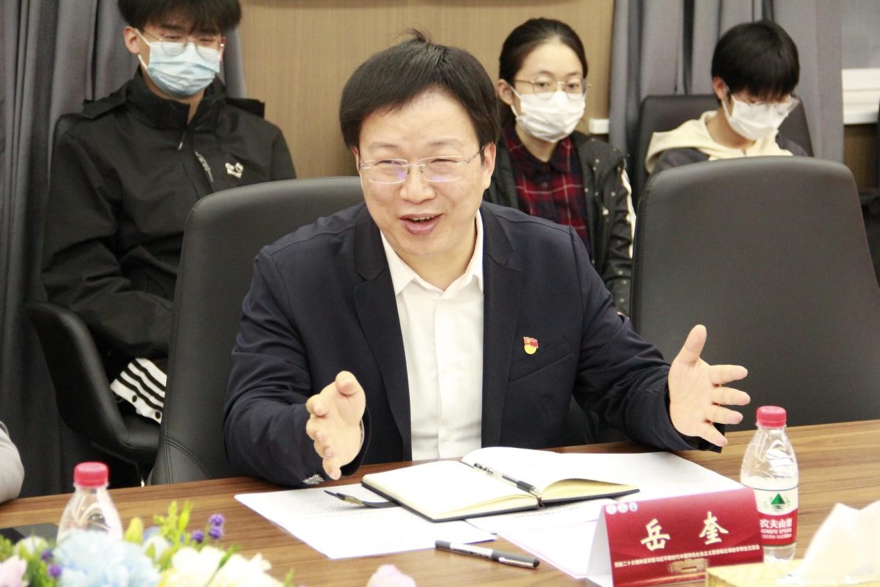 岳奎为与会师生生动宣讲了党的二十大精神。通过中国共产党如何从大党到强党、中国如何从大国走向强国的实例分析,以及我党在新征程上举什么旗、走什么路、以什么样的精神状态继续前进的重大问题的研判,系统指出学习宣传贯彻党的二十大精神,就是要全面把握习近平新时代中国特色社会主义思想的世界观、方法论和贯穿其中的立场观点,正确认识把握习近平新时代中国特色社会主义思想的精神实质,深刻领会党的创新理论的道理、学理、哲理,做到知其言更知其义、知其然更知其所以然,深刻领会在新时代新征程上必须切实把习近平新时代中国特色社会主义思想贯彻落实到为党育人、为国育才的各方面和全过程。他强调,华中大青年学子们要深刻领会党中央在经济建设、政治建设、文化建设、社会建设的重大部署,同心向党跟党走,胸怀“国之大者”、系好人生的第一粒扣子,在新时代新征程中奋勇争先、建功立业。