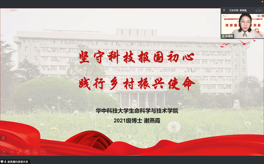 2021级博士研究生谢燕霞从亲身经历出发,以“坚守科技报国初心,践行乡村振兴使命”为题,分享了自己所在的科研团队如何用生物技术赋能云南临沧茶叶产业,走上科技扶贫之路。党的二十大报告中提到我们完成了具有深远历史意义的三件大事,其中一件就是打赢了脱贫攻坚战役。脱贫不是终点,乡村振兴还在继续,要如习近平总书记所说,要怀抱梦想又脚踏实地,要真正的把论文写在祖国大地上,用科技扶贫,用科技振兴,做一个敢担当,能吃苦,做肯奋斗的新时代好青年。