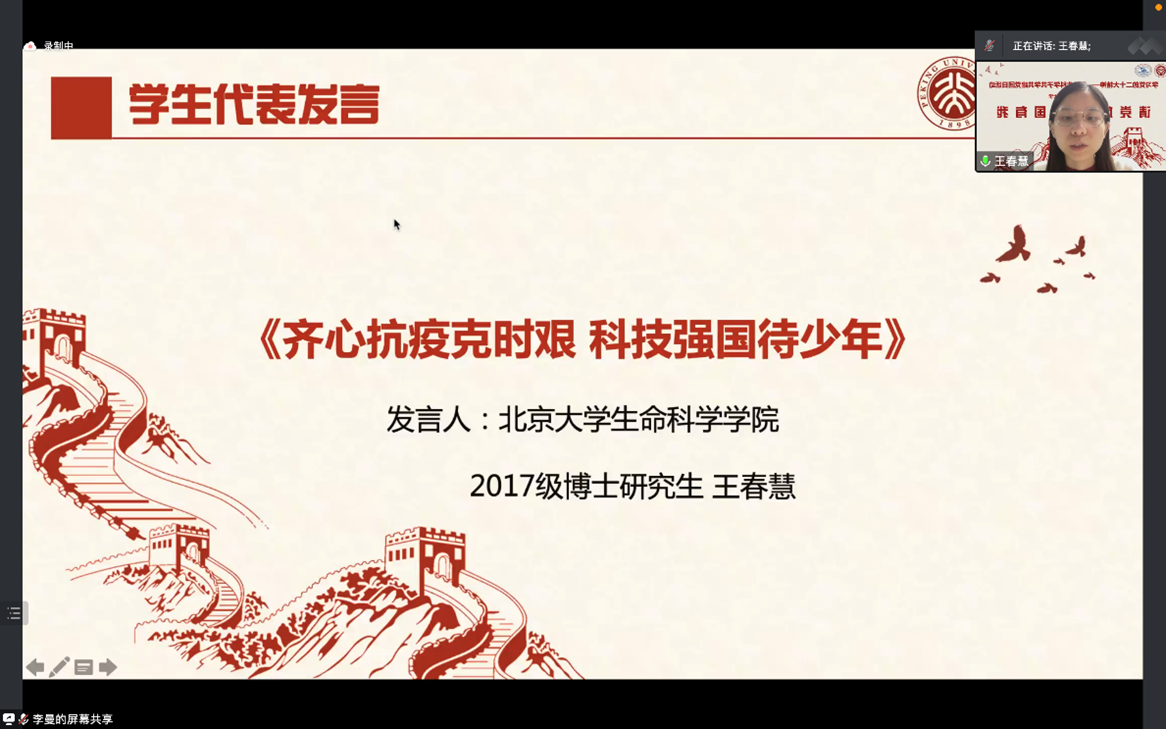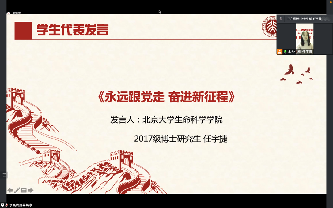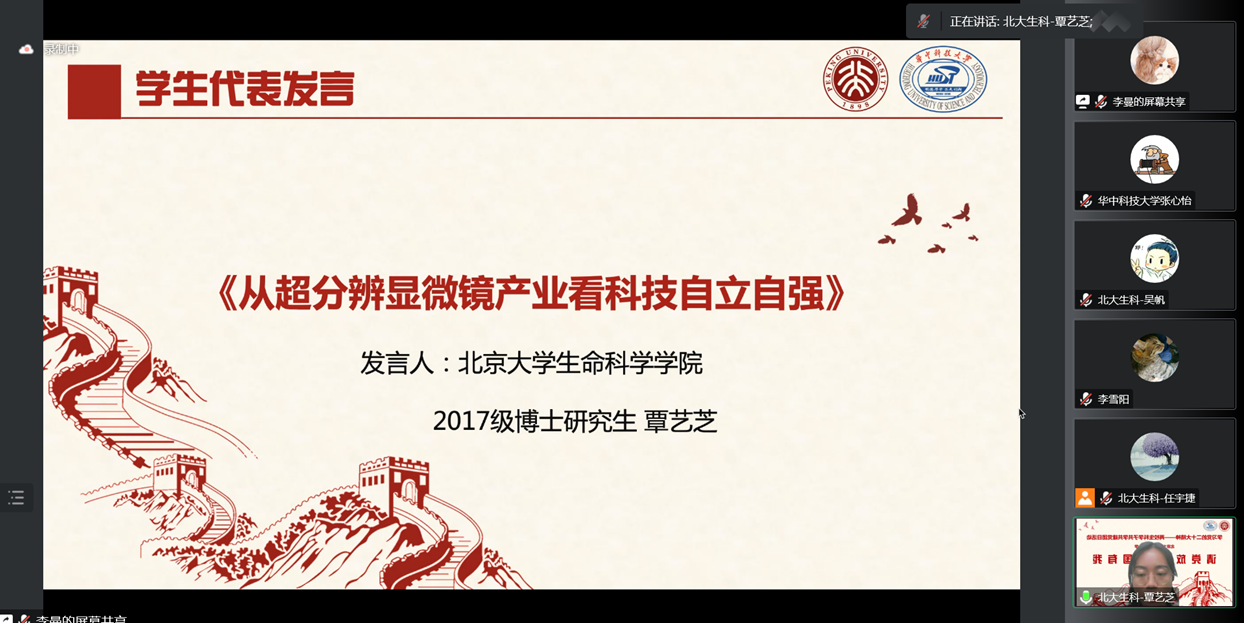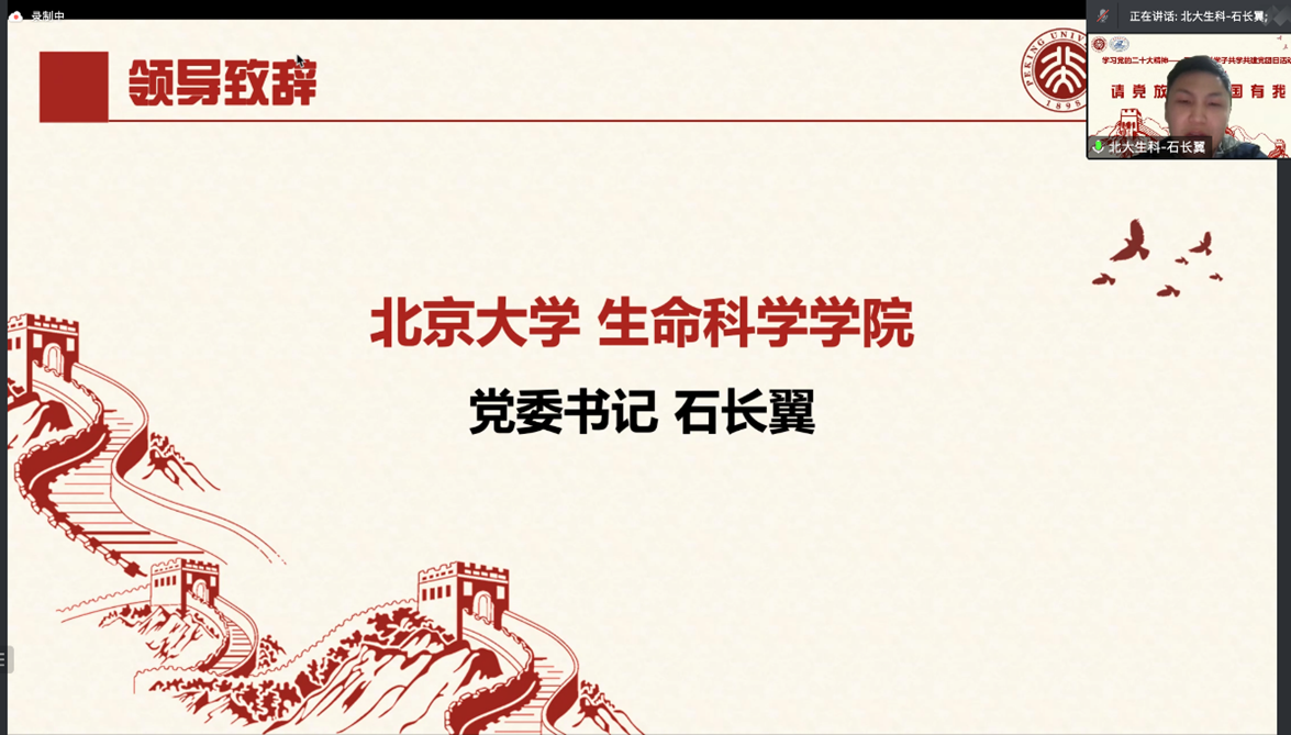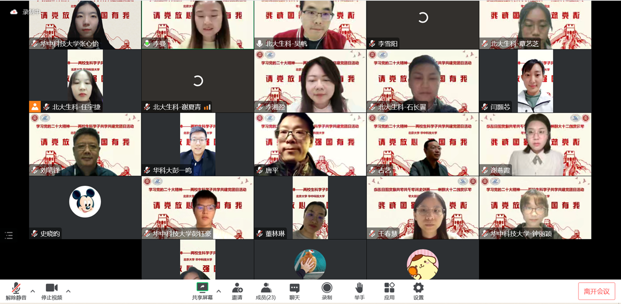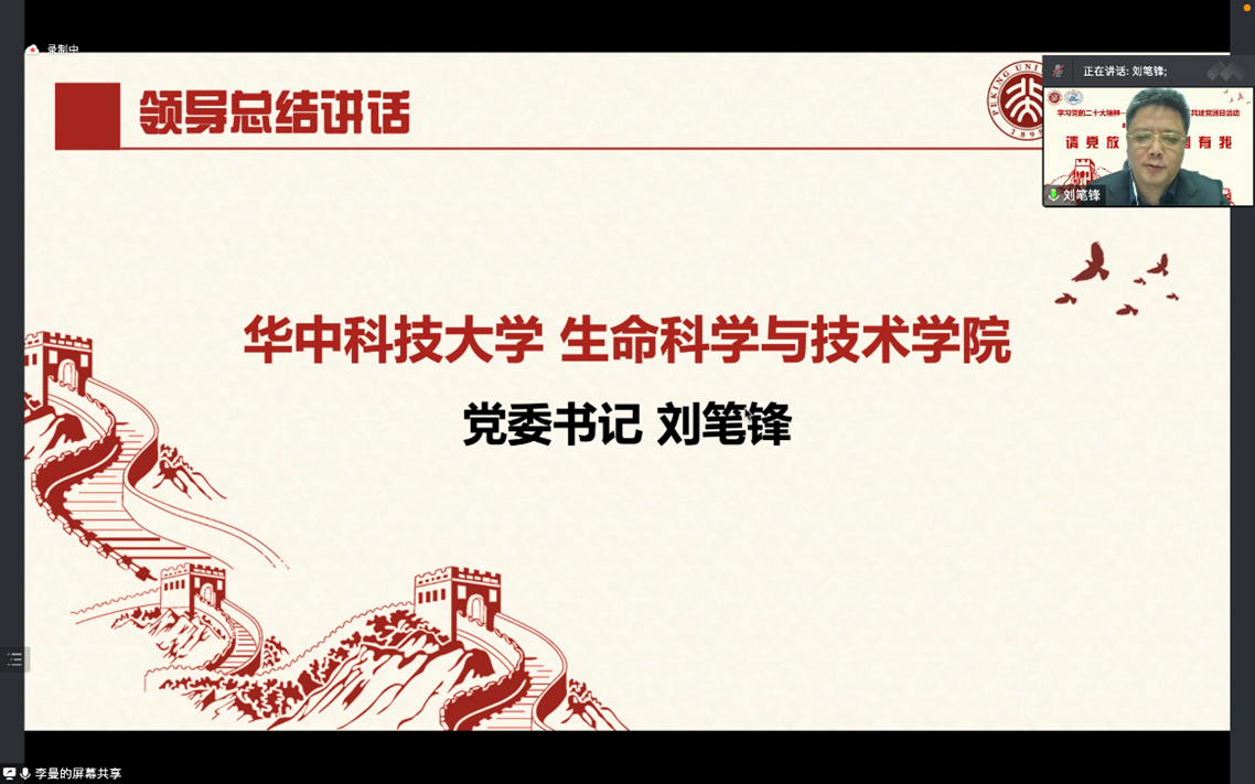 活动最后,华中科技老员工命科学与技术公司党委书记刘笔锋指出,京汉两地同频共振,交流学习一同成长,党员、团员同志以自己的青春之姿奋进新征程。正如习近平总书记在大会上所提出的,优先发展教育科技自立自强和坚持人才引领,是中国强盛之基,是立足千秋业的大战略和大智慧,为党育人为国育才,我们深感责任重大使命光荣。今天,我们欣喜地看到我们培养的青年,心怀国之大者,将人生理想融入国家和民族的事业中去,争做有理想、有本领、有担当的时代新人,是国家的未来与民族的希望。最后,他表示希望两院成为亲密伙伴,继续深化合作交流,待到疫情消散之日,欢迎北大生科院的同志们朋友们来到美丽的江城武汉,来到1037号森林大学,让两院的友谊如同森林大学葱葱的树木一样长存常青!