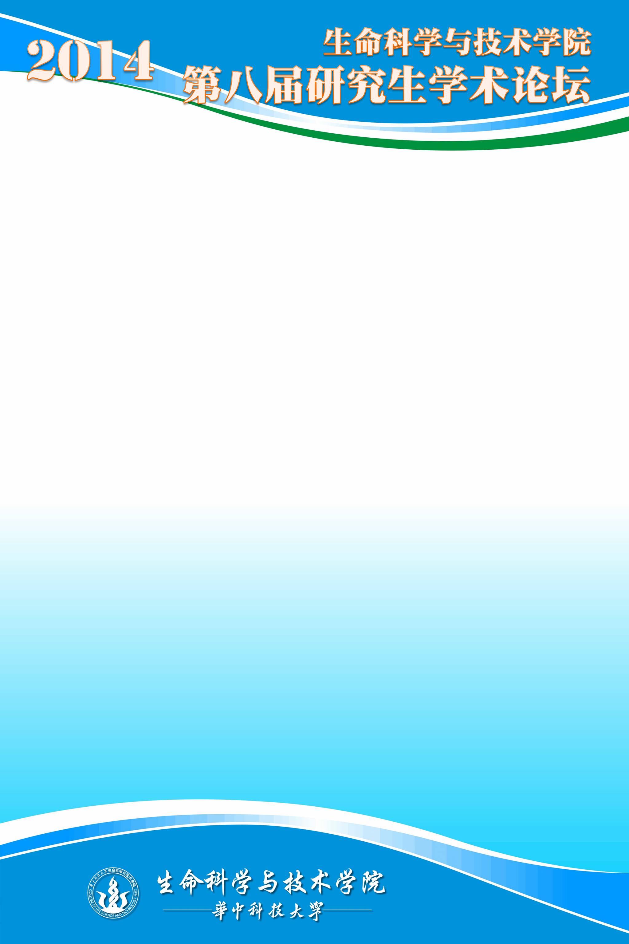 墙报统一大小:60 cm (W) * 90 cm (H),请务必输出为PDF或JPG格式,并在2014年12月25日前发至lifestudent@hust.edu.cn。墙报背景JPG图片见附件一。