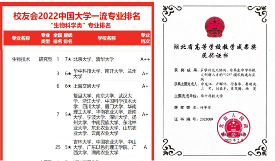 基础学科生物科学与技术实验班(生实班):选拔招生30人,生实班是紧紧围绕国家生物经济发展需求,以培养生命科学领域拔尖创新人才为目标。现为生物技术国家一流本科专业(首批)、国家特色专业和湖北省品牌专业,在2022年国家一流本科专业排名中位列全国第3。团队力量雄厚,拥有湖北省教学名师和荆楚好老师等国家级教学团队,多次荣获湖北省教学成果特等奖和国家教学成果奖。