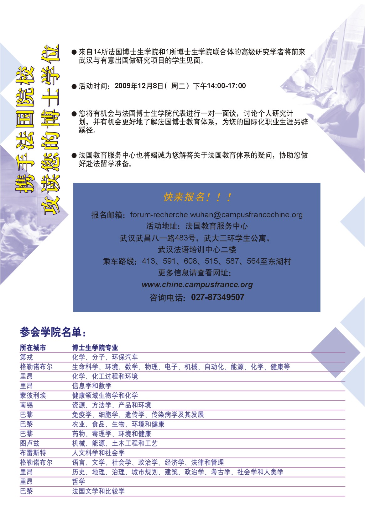 法国驻华大使馆,法国驻武汉总领事馆以及法国教育服务中心武汉中心荣幸的通知您,2009“法国博士生公司”见面会即将举行。