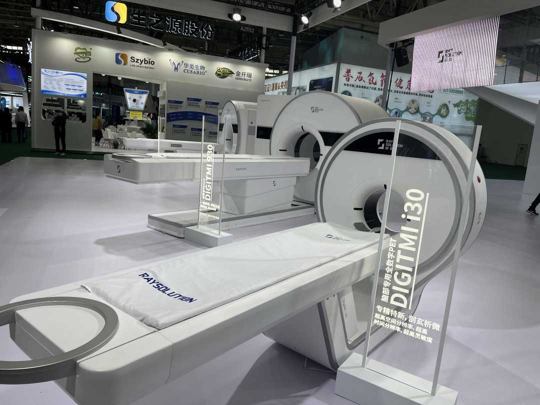 在锐世医疗所在的500平米展馆中,由团队自主研发的新一代全数字PET/CT DigitMI 930亮相其中。去年12月,这台设备通过了中国医疗器械注册认证,正式获准进入市场。相关指标显示,DigitMI 930能在20秒内完成单个床位的扫描成像,全身扫描仅需80秒,单床位成像速度为当前全球第一。