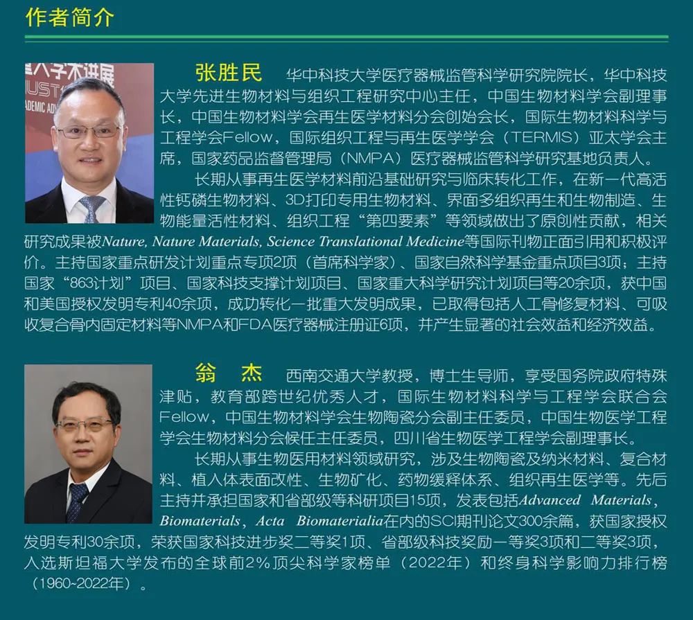 参与撰写的作者均为国内重点单位长期从事生物医用陶瓷研究的一线专家。各章节的分工如下:第1章由西南交通大学翁杰教授和必威西汉姆联官网张胜民教授负责撰写;第2章、第4章和第10章由西南交通大学翁杰教授负责撰写;第3章由中国科公司上海硅酸盐研究所吴成铁研究员负责撰写;第5章和第12章由武汉理工大学戴红莲教授负责撰写;第6 章由四川大学杨帮成教授负责撰写;第7章由必威西汉姆联官网张胜民教授负责撰写;第8章由华东理工大学袁媛教授负责撰写;第9章由武汉理工大学韩颖超教授负责撰写;第11章由西南交通大学鲁雄教授负责撰写;张胜民教授和翁杰教授对全书进行了统稿。