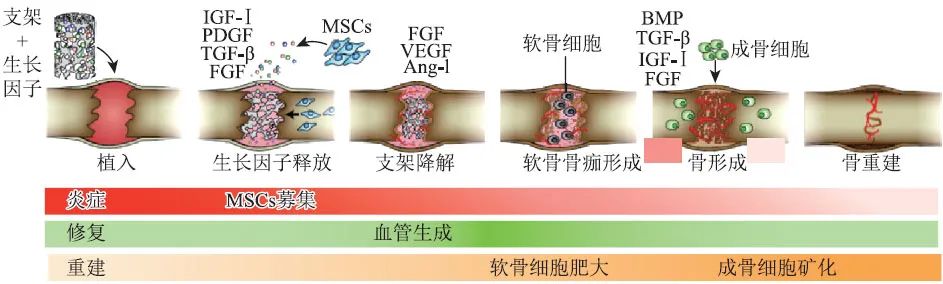 骨组织工程支架释放多种生物活性因子作用于骨形成的不同时相以促进内源性干细胞(MSCs)募集到缺损部位,并沿预定的途径扩增、分化以实现骨组织愈合