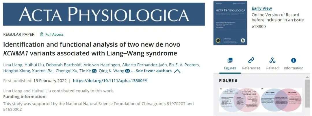 2022年2月13日,王擎团队在生理学权威期刊Acta Physiologica发表相关研究成果。论文报道了两个新发现的导致“梁-王综合征”的KCNMA1基因突变,并揭示了该突变导致疾病发生的分子机制,再次为深度解析梁-王综合征的遗传基础提供了科学证据。