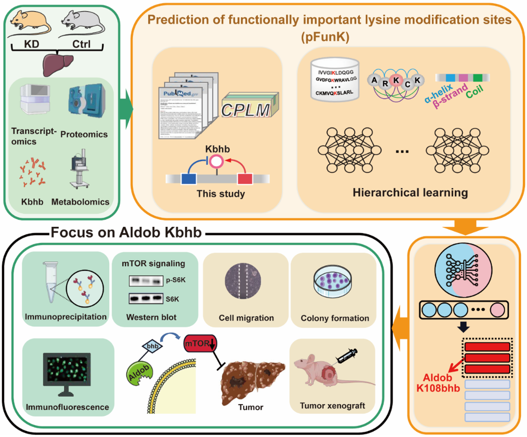 图1. 实验流程。利用喂养生酮或对照饮食的小鼠肝脏,开展转录组、蛋白质组、β-羟基丁酰化组和代谢组的多组学分析。构建了分层学习框架pFunK,可预测功能重要的赖氨酸修饰位点。使用pFunK分析β-羟基丁酰化组数据,预测ALDOB的K108为潜在重要的β-羟基丁酰化位点。后续实验揭示ALDOB的β-羟基丁酰化调控其酶活、mTOR信号通路及肿瘤增殖。