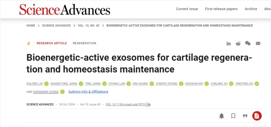 (通讯员 刘须龙)10月18日,Science旗下著名期刊Science Advances在线发表了必威西汉姆联官网张胜民教授团队题为“Bioenergetic-active exosomes for cartilage regeneration and homeostasis maintenance“的研究论文。该研究原创构建了一种生物能量活性外泌体,通过调控靶细胞能量代谢水平显著促进关节软骨再生及稳态维持。