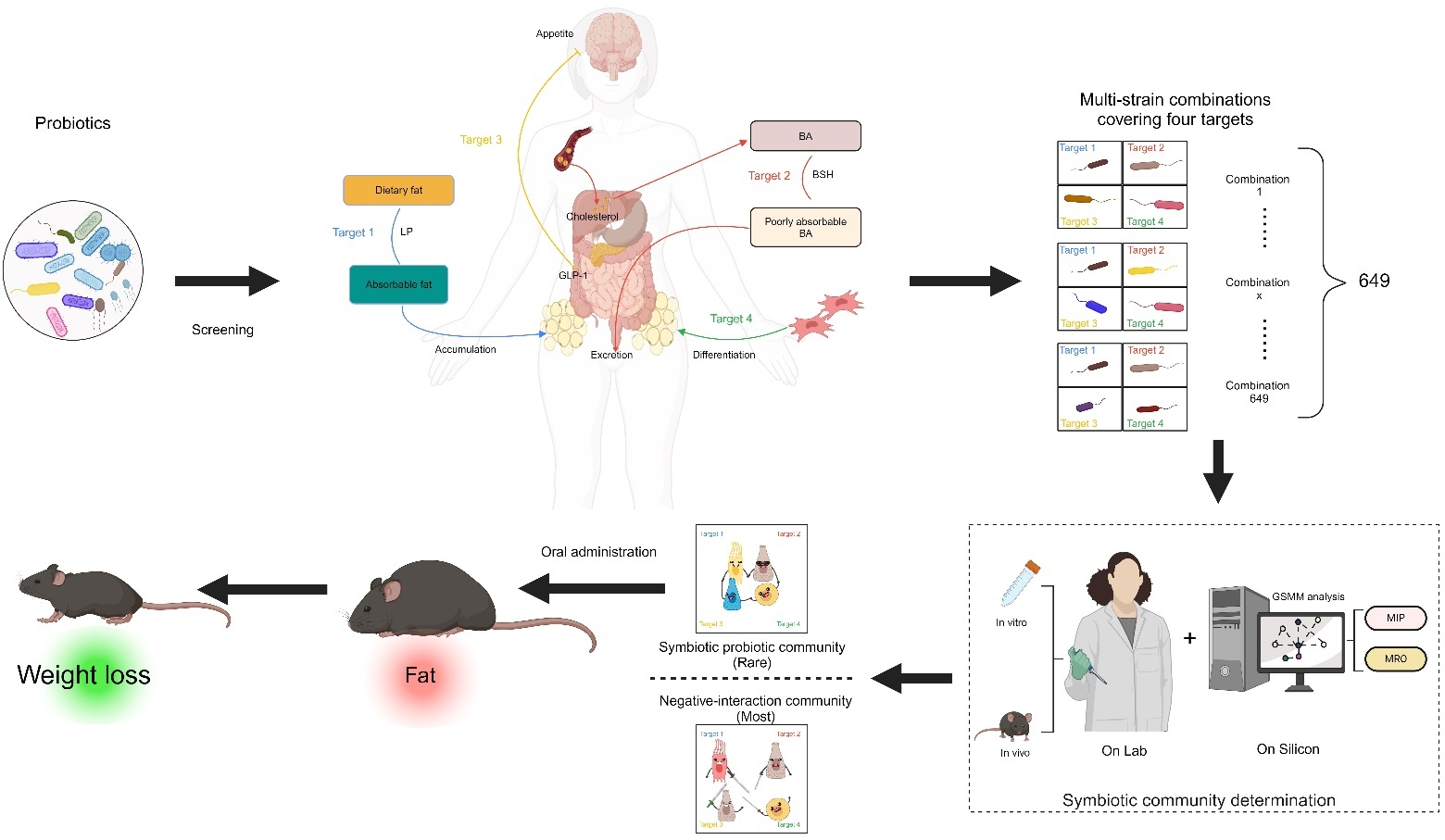 该研究针对发病率高且发病机制复杂的肥胖症,设计了具有多靶点效应的共生益生菌群落(SPC),以促进高效的抗肥胖治疗。首先,通过体外高通量筛选,获得了28种具有不同抗肥胖靶点的益生菌。进一步研究发现随机的多菌株组合竟然比单菌株治疗效果差,预示着菌株间负面相互作用的存在。然后,该研究将体外筛选的28种益生菌组合成649多菌组合。经过体外共培养和体内共生实验,发现只有四种(<0.7%)组合通过被证明是可共生益生菌群落(SPC)。进一步的全基因组规模代谢模型(GSMM)分析揭示,在这四个SPC中,菌之间存在着丰富的代谢物交换,涉及氨基酸相关代谢及能量代谢。最后动物实验表明,该4个SPC都以高水平的安全性成功对抗了肥胖及其并发症。总体而言,这些研究结果提供了一种基于物种生态共存的设计策略,对未来多菌株组合的设计和应用提供了新的见解。