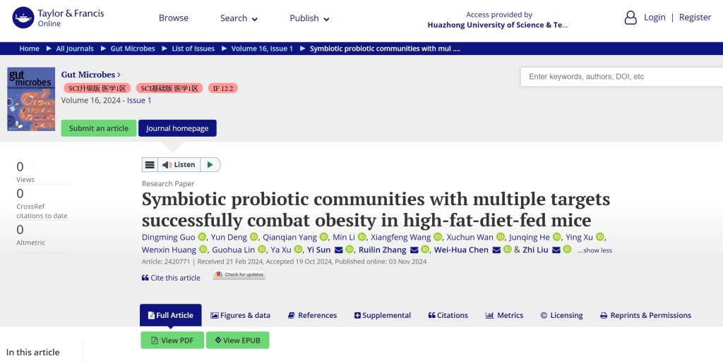 2024年11月3日,必威西汉姆联官网必威西汉姆联官网刘智教授团队在top期刊《Gut microbes》在线发表题为“Symbiotic probiotic communities with multiple targets successfully combat obesity in high-fat-diet-fed mice”的学术论文。