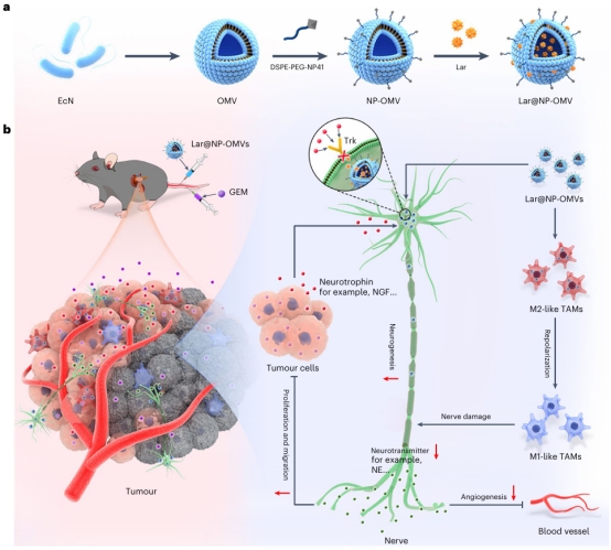 该研究以来源于益生菌大肠杆菌Nissle 1917的外膜囊泡(OMVs)为载体,在其表面修饰神经结合肽NP41,负载原肌球蛋白受体激酶(Trk)抑制剂拉罗替尼(Lar)。此载药OMVs(Lar@NP-OMV)靶向肿瘤内神经,阻断NGF/Trk信号通路,有效干预神经功能,抑制神经的增殖、轴突生长及神经递质的分泌;此外,OMVs还能将M2型肿瘤相关巨噬细胞(TAMs)逆极化为M1型,释放细胞因子如TNF,进一步诱导神经损伤,通过减弱去甲肾上腺素/β-肾上腺素受体信号,有效抑制神经诱导的肿瘤细胞增殖、迁移和血管生成,并显著改善肿瘤免疫微环境。在多种荷胰腺肿瘤动物模型中证实Lar@NP-OMVs能有效抑制肿瘤生长和转移,并能减弱化疗药物吉西他滨促神经浸润和轴突生长作用,显著改善化疗疗效。该研究为改善胰腺癌化疗效果提供了新的思路。