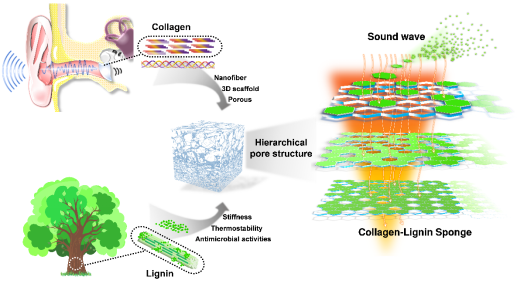 胶原蛋白纳米纤维-木质素(CLS)吸声海绵的制备和结构示意图