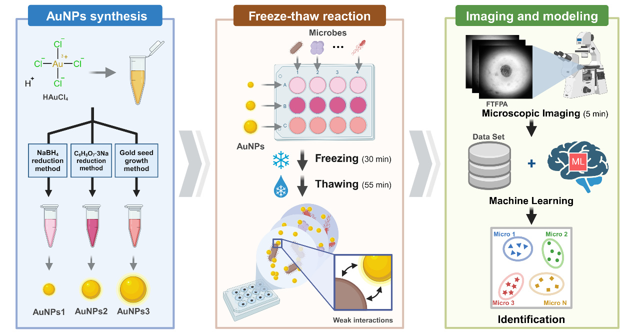 利用FTFPA进行微生物分类的流程图。FTFPA 是通过三种AuNPs与微生物之间的冻融反应生成的,并在采集明视野显微图像后构建机器学习分类模型。