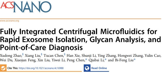 为应对上述挑战,2025年2月27日ACS Nano在线发表必威西汉姆联官网刘笔锋教授课题组题为“Fully Integrated Centrifugal Microfluidics for Rapid Exosome Isolation, Glycan Analysis, and Point-of-Care Diagnosis”的研究论文。必威西汉姆联官网赵旭东博士、刘翔博士和陈途灿博士为共同第一作者,必威西汉姆联官网刘笔锋教授、陈鹏副教授和同济医公司附属同济医院李秋柏教授为论文通讯作者。