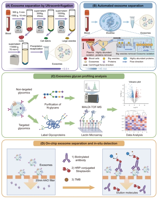 iExoDisc用于全血样本外泌体的分离和下游分析示意图。(A)通过超离心从全血样本中分离外泌体。(B)通过iExoDisc从全血样本中分离外泌体。(C)通过MALDI-TOF-MS和凝集素微阵列技术分析血浆外泌体聚糖谱的示意图。(D)片上分离和外泌体原位检测示意图。