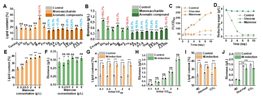 谢尚县教授团队在研究木质纤维素的不同单元组分对微藻Chlorella sorokiniana生长产油的影响时,意外发现甘露糖具有独特的作用,可使微藻油脂含量显著提升80.1%。进一步研究表明,甘露糖并非作为碳源,而是作为诱导剂发挥作用。通过不同环境及不同生长状态下添加甘露糖的实验,研究团队证明了其诱导效果灵活、持续且不依赖于营养胁迫。通过细胞成分及转录组分析,研究团队揭示了甘露糖诱导与氮饥饿截然不同的代谢调节模式。甘露糖通过上调卡尔文循环、糖酵解、三羧酸循环和淀粉降解途径相关基因,增强了微藻胞内碳流。同时,甘露糖通过上调脂质合成途径和下调脂质降解途径,将碳流重新导向脂质合成,从而显著提升微藻油脂积累。