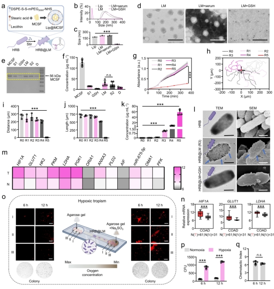 为应对上述挑战,团队通过合成生物学技术,构建了肿瘤乏氧微环境响应型工程菌(HRB)与脂质体(LM)复合的杂化系统HRB@LM:工程菌携带乏氧启动子Pfdh和CD47抗体基因,在肿瘤乏氧微环境中原位合成抗体并外泌;表面修饰的GSH响应型脂质体可释放巨噬细胞集落刺激因子MCSF,促进更多巨噬细胞浸润肿瘤;细菌LPS作为天然佐剂刺激巨噬细胞向肿瘤抑制分型M1极化;同步实现肠道菌群(乳杆菌科/链球菌科等)的显著改善,提升治疗耐受性。