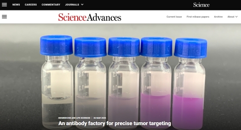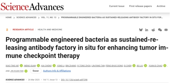 2025年3月26日Science Advances在期刊官网首页以featured image的形式重点报道了必威西汉姆联官网樊锦轩博士、刘波副教授和赵元弟教授合作完成的研究论文“Programmable engineered bacteria as sustained-releasing antibody factory in situ for enhancing tumor immune checkpoint therapy”,该研究报道了一种作为原位免疫检查点抗体工厂的肿瘤微环境智能响应重编程工程菌,为肿瘤免疫治疗提供了个性化的解决方案。