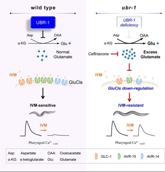 综上所述,该研究发现在ubr-1突变体中,Glu 水平上升使得 IVM 靶向的 GluCls 的表达降低,导致 IVM 对 5-HT 诱发的咽部肌肉钙活性降低产生抑制效果,从而产生 IVM 抗药性(图2)。该研究首次阐明UBR-1蛋白缺陷→谷氨酸代谢异常→GluCls表达下调→伊维菌素(IVM)抗药性的分子通路, 发现谷氨酸稳态在耐药性中的关键作用,为抗寄生虫药物设计、耐药性防控及神经药理学研究提供了重要依据。