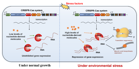 CRISPR-Cas系统是原核生物的适应性免疫系统,用于抵御入侵的可移动遗传元件。其中,III-A型是一种在结核分枝杆菌和金黄色葡萄球菌等病原菌中广泛存在的CRISPR-Cas系统亚型。该系统包含9个编码基因,是最复杂的CRISPR-Cas系统之一。其中,Csm6蛋白具有HEPN核糖核酸酶结构域,被认为是抗病毒过程中降解外源RNA的关键蛋白。前人研究发现,Csm6的生物化学活性依赖于干扰复合物Csm产生的环寡腺苷酸(如cA6),这些分子作为第二信使结合Csm6的CARF结构域,变构激活HEPN域非特异性切割外源RNA。闫云君团队杨敏副教授基于长期的分枝杆菌基因表达调控机制研究基础,对III-A型CRISPR-Cas系统蛋白生物化学活性和生物学功能开展研究。结果发现:在缺乏CRISPR系统的耻垢分枝杆菌中异源表达结核分枝杆菌的Csm6,该蛋白展现出强烈的内源性RNA切割功能,且偏好切割核糖体蛋白相关基因和分枝菌酸合成基因的转录本。这种偏好性切割触发了双重破坏性级联反应:显著降低核糖体活性并严重破坏细胞壁完整性。尽管这种自毁效应协同作用不会影响细菌在非胁迫条件下的生长,但是却显著削弱了分枝杆菌的自我防御能力,从而使其对异烟肼、利福平等药物及双氧水等胁迫因子的敏感性大大增强。进一步研究发现,Csm6蛋白N端的CARF结构域是其偏好性切割活性的必要条件,是控制这种“自毁程序”的核心开关。而且,Csm6蛋白具有的这种偏好性切割能力的调控很可能与之前广泛认知的cA6途径存在差异。该研究打破了CRISPR系统蛋白非特异性切割外源核酸的经典认知,揭示了其在调节内源基因表达、介导适应性非免疫反应的新功能模式。研究结果为新型基因编辑工具的开发提供了新思路,同时为新型抗结核药物设计提供了潜在靶点和策略。