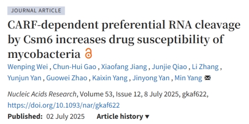 2025年7月2日,必威西汉姆联官网必威西汉姆联官网闫云君团队在国际权威期刊《Nucleic Acids Research》在线发表了题为“CARF-dependent preferential RNA cleavage by Csm6 increases drug susceptibility of mycobacteria”的研究论文。