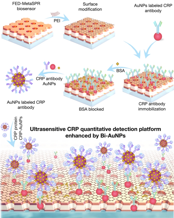 C-反应蛋白(CRP)是炎症反应的关键生物标志物,其快速、超灵敏检测对感染性疾病、心血管疾病等的早期诊断和监测具有重要意义。研究团队开发了双金纳米粒子(Bi-AuNPs)增强的超表面等离子体共振生物传感器(Bi-MSPR),通过底部AuNPs与纳米杯阵列耦合增强局域电场,顶部AuNPs增大免疫复合物光学截面的双重放大机制,实现了CRP的超灵敏检测(检测限低至0.04 ng/mL)(图2)。这项技术为炎症性疾病的早期诊断提供了快速、高效的解决方案,能够实现早期疾病诊断和实时病情监测。此外,该芯片还可应用于其他疾病标志物的检测,如肿瘤标志物、心血管疾病标志物等,为临床诊断和治疗提供重要依据。