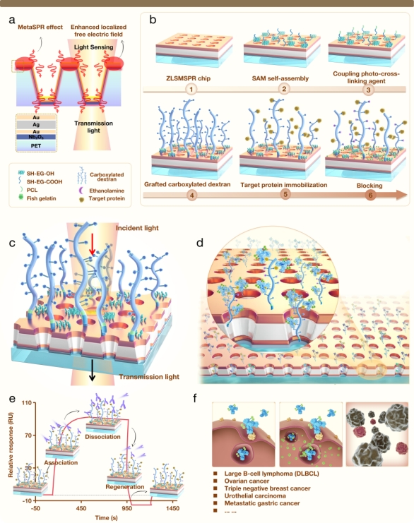 研究团队首次将零损耗半导体材料Nb2O5与超表面等离子体共振(MetaSPR)技术结合,开发出ZLSMSPR芯片传感器。该传感器利用Nb2O5的零消光系数特性,显著降低光损耗,将局部SPR效应放大30倍,实现了对分子相互作用的超高灵敏度检测(检测限低至0.018 μg/mL)。 团队还通过卡宾光交联技术在传感器表面构建高密度羧基化葡聚糖层,开发出ZLSMSPR-CDH生物传感器,不仅提升了蛋白固定化能力,还保持了生物分子的活性(图1)。这一创新设计使传感器能够实时、无标记地监测ADC与肿瘤靶点的亲和力变化,为ADC药物开发提供了精准、高效的评估工具。
