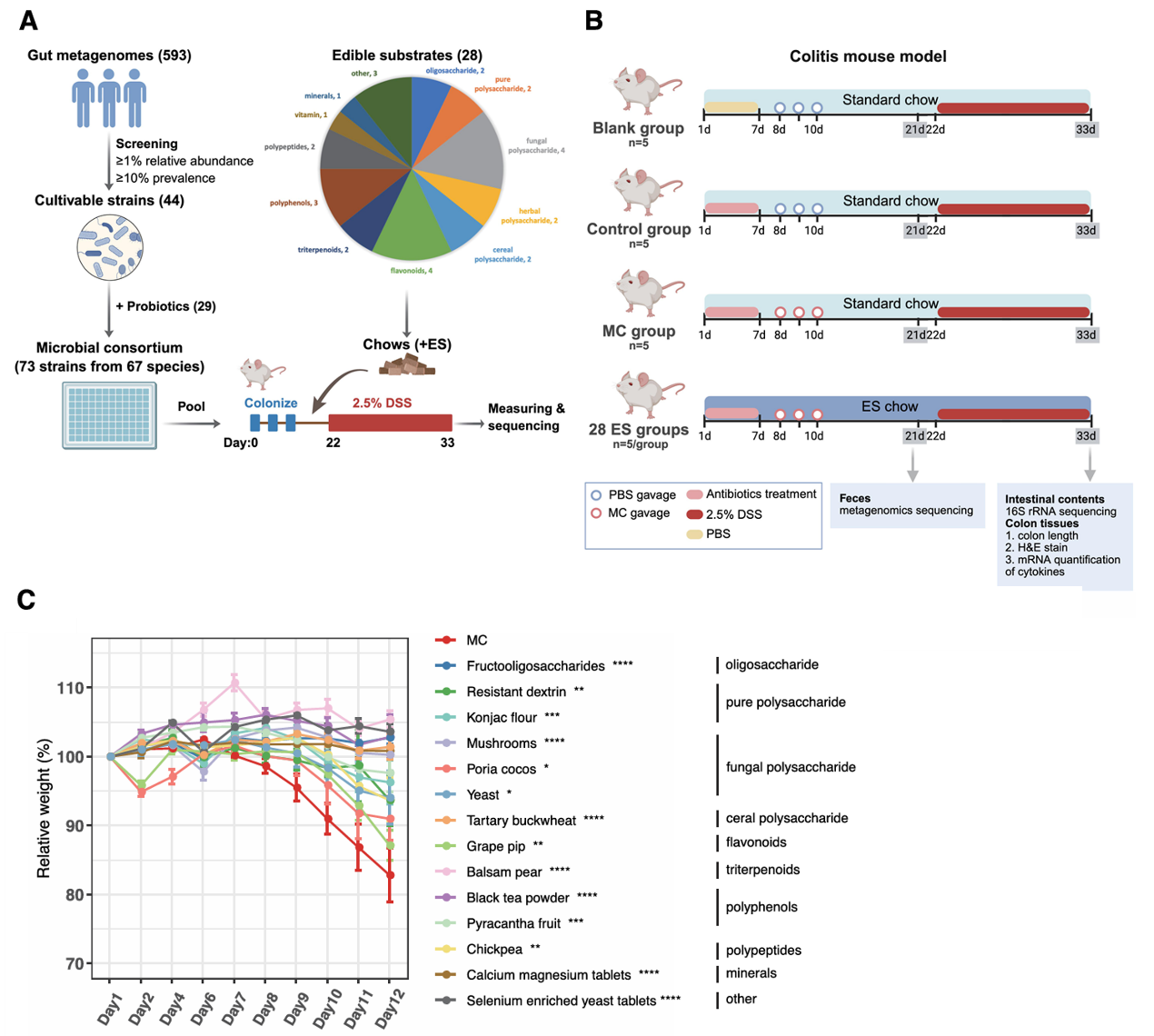 在该研究中,研究团队使用多组学方法系统地研究了体内微生物群-益生元相互作用。构建了一个由健康人的代表性肠道核心微生物群和选定的益生菌组成的人工微生物群落(MC),并策划了一组可食用基质(ES),包括益生元和益生元候选物,以探索饮食、微生物和体内宿主免疫系统之间的相互作用,以及它们对宿主健康的影响。抗生素处理的小鼠进行MC定植,并喂食含有ES的饮食,揭示了移植MC对饮食ES的不同反应,其中14种ESs表现出对DSS诱导的小鼠肠道炎症的显著保护作用(图1)。