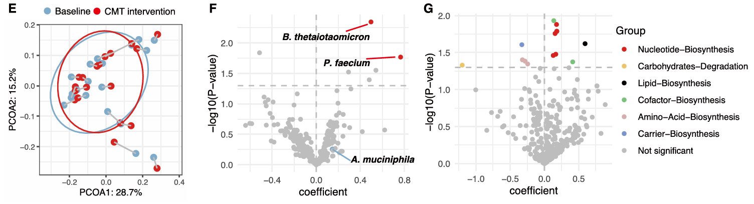 最后,研究团队在健康的人类志愿者中进行了干预试验,试验表明CMT选择性地增加了B. thetaiotaomicron的丰度,而不会导致整体肠道微生物组的显著变化。