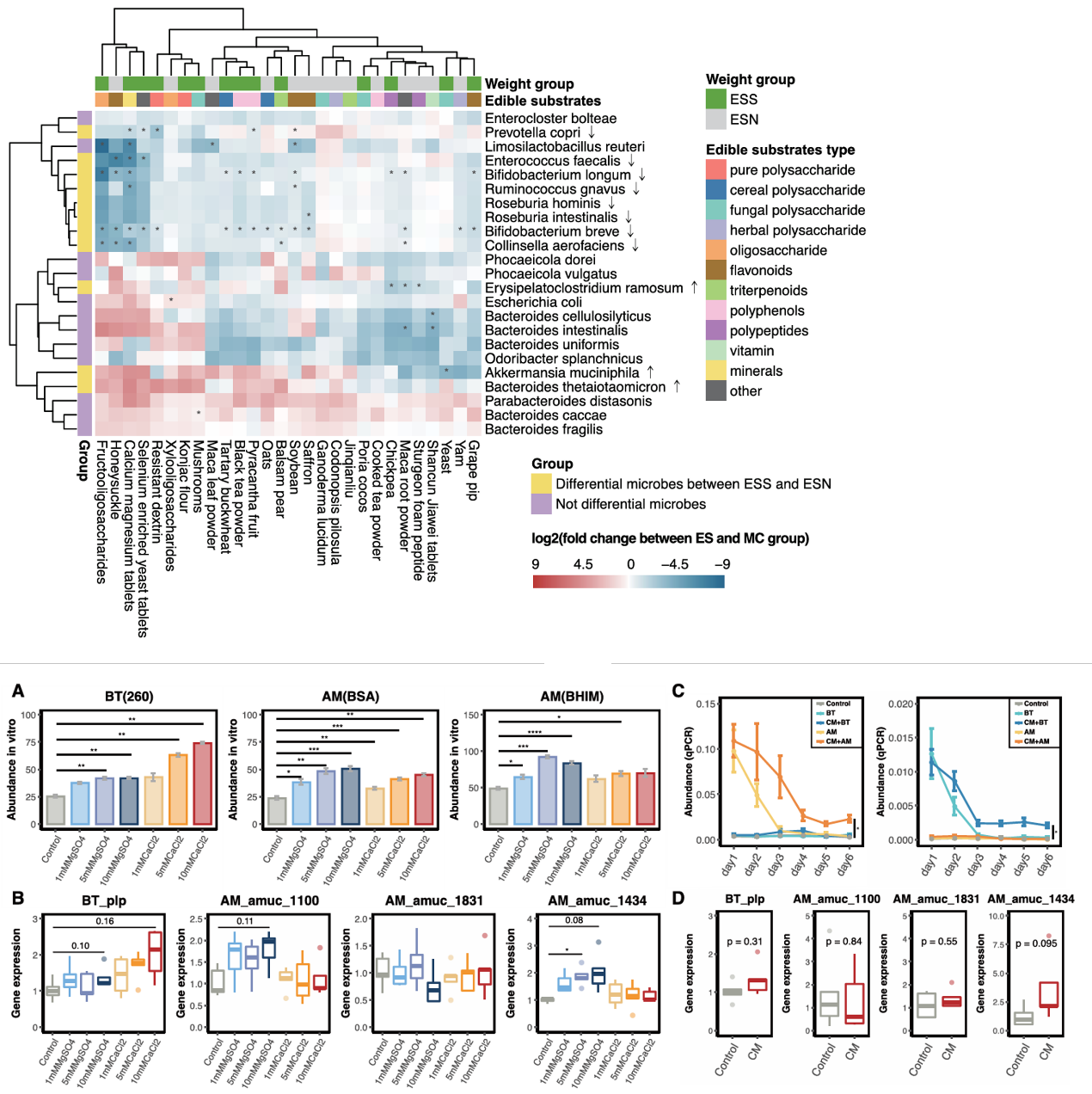 研究团队进一步确定了两种移植微生物,B. thetaiotaomicron 和 A. muciniphila在DSS诱导前被富集,能够抑制促炎细胞因子的表达并预防结肠炎,钙镁片(CMT)增强了它们的功效。然后通过测试这些微生物在体外和体内的生长和基因表达来验证这两种微生物和CMT的协同效应,支持这些组合方案在结肠炎治疗中的可行性。