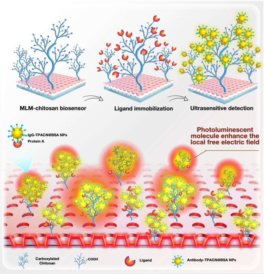 表面等离激元共振(SPR)技术因其免标记、实时、可获取分子互作动力学信息等优势,被广泛应用于分子互作研究和临床诊断。然而,传统SPR在检测低浓度度生物标志物时,灵敏度不足,难以满足复杂样本检测需求。近年来,超表面等离激元共振(MetaSPR)技术通过纳米结构设计和表面化学手段,显著提高了检测灵敏度,但仍需进一步提升以满足新冠病毒等病原体高灵敏检测需求。面对超灵敏检测技术在新兴生物芯片领域的迫切需求,本研究首次提出并验证了一种基于非辐射能量转移机制的创新型超表面等离激元共振(MetaSPR)生物传感器。研究团队设计并制备了多层金属增强的MetaSPR(MLM-MetaSPR)芯片,系统优化了纳米杯阵列结构与多层金属膜厚度;进一步通过卡宾光交联技术引入三维羧甲基壳聚糖支架,显著提升蛋白固定效率与传感器灵敏度。