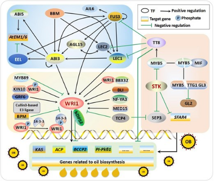 图2. 以WRI1和STK为中心的油脂合成和代谢调控网络模型
