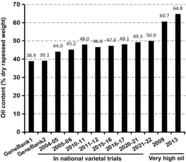 过去20年已发表了几百篇有关含油量的转基因或基因编辑(基因工程)研究文章,基于已进行转基因或基因编辑的上百个基因的研究结果,它们均能显著提高含油量,但进入田间试验的报道比较少。在中国,传统的油菜杂交选择育种在过去20多年已使含油量从40%提高到50%,最近3年国家油菜区试中已有一批品种超过50%,已报道多份种质含油量超过64%。