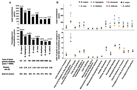 1. 遗传控制中心:首先系统分析了含油量QTL位点,揭示了含油量遗传控制并不仅仅局限于油脂合成生化途径中的基因;鉴定了油菜、大豆、花生、芝麻、棉花和玉米基因组的所有油脂代谢基因,并进行了比较基因组学分析,指出油脂代谢基因组数与含油量无明显的相关关系,即含油量无多倍体优势。
