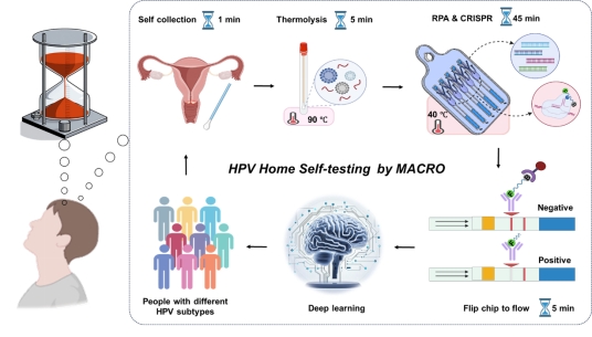 研究团队创新性地设计了“多维空间沙漏结构”微流控芯片,用户仅通过翻转动作即可完成液体分步控制,无需任何外部设备。系统结合化学裂解与放热反应,替代传统核酸提取与恒温设备,实现样本裂解、扩增与检测一体化。通过RPA与CRISPR/Cas12a联用,系统在1小时内实现单分子级灵敏度,并完成4种HPV亚型或3种呼吸道病毒的同时检测。样本经化学裂解释放核酸,通过手驱芯片完成RPA扩增与CRISPR检测,反应液经沙漏结构流向试纸条,结果可通过裸眼或手机AI自动判读。临床验证显示,MACRO在140例宫颈拭子样本中准确率达98.57%,在70例呼吸道病毒样本中达成100%诊断一致性。