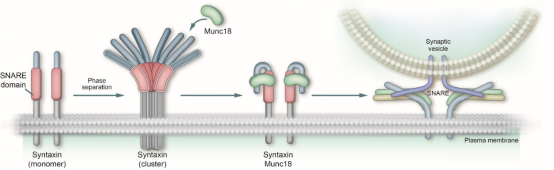 Syntaxin蛋白簇通过其胞质结构域内的相互作用驱动相分离而形成,这些聚集结构可作为分子储备库。Munc18能够结合并闭合Syntaxin的胞质结构域,将其从蛋白簇中物理分离,从而启动膜融合过程。