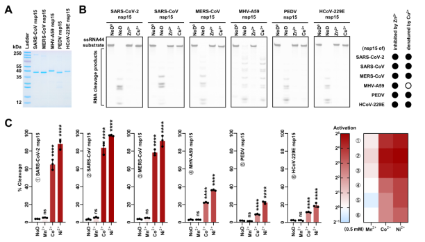 图1 特定金属离子对不同冠状病毒nsp15 RNA切割活性的影响