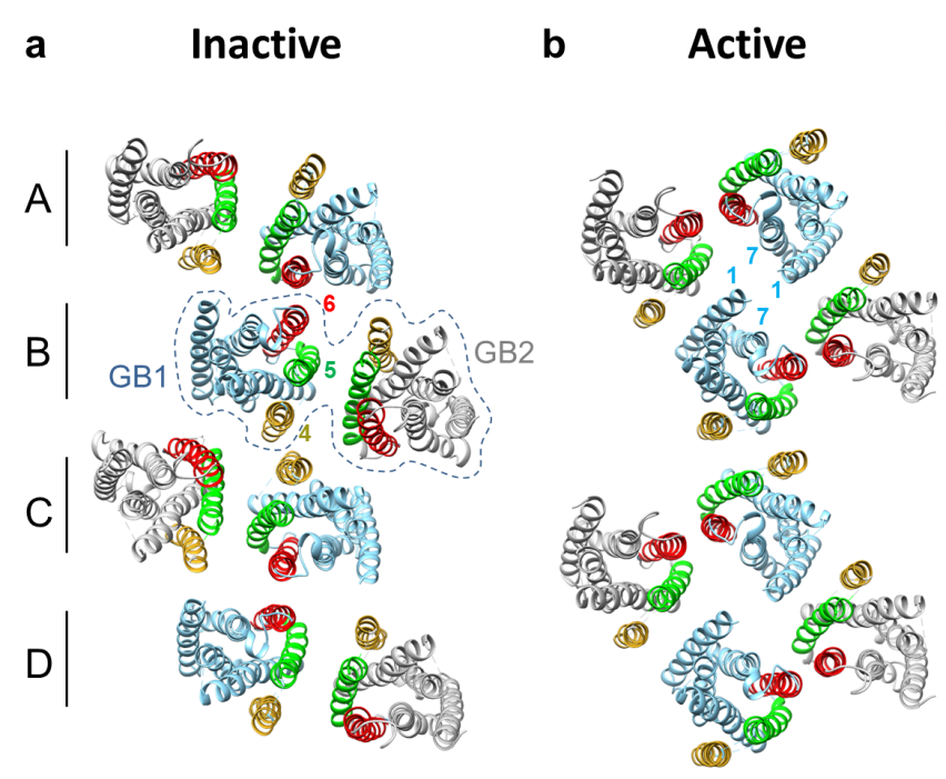 图:GABAB 受体跨膜区在非激活(a, 左边)和激活状态下(b,右边)的俯视图