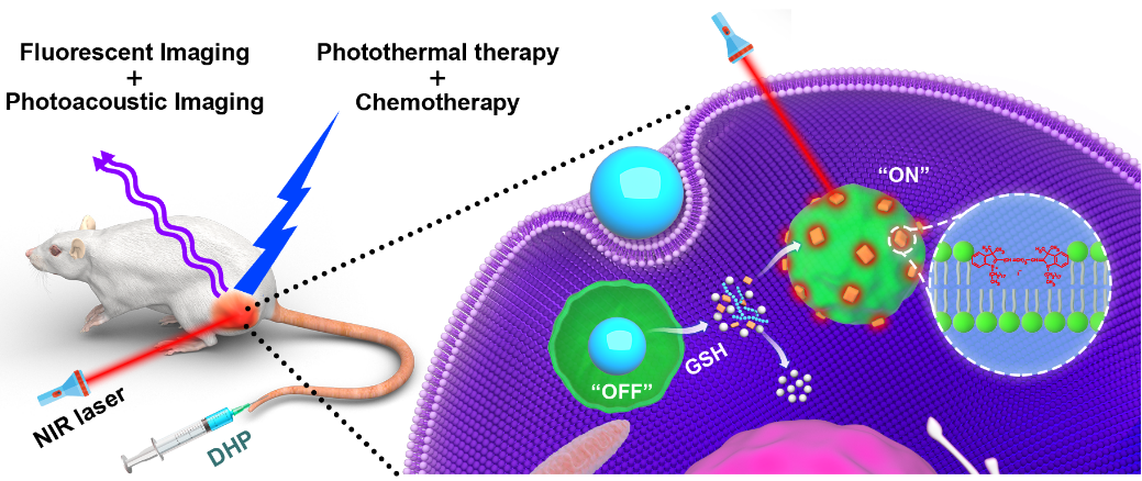 肿瘤微环境刺激可激活的诊疗一体化纳米药物在精准纳米医药中地位十分重要,它们具有信噪比高、背景干扰小等优点,为肿瘤的治疗以及多模式成像诊断提供了一种便捷手段。然而,复杂的成分以及制备工艺严重阻碍了肿瘤微环境刺激可激活诊疗一体化纳米药物的临床转化。本文报道了一种简单的谷胱甘肽刺激可激活的诊疗一体化纳米药物用于肿瘤的双模成像以及化疗光热综合治疗。基于简单的一步透析法制备出只有两种组分(羟乙基淀粉-紫杉醇偶联物,HES-SS-PTX,和近红外荧光分子DiR)的诊疗一体化纳米药物(DHP),巧妙的利用了荧光分子DiR聚集诱导淬灭(ACQ效应)实现肿瘤细胞微环境响应刺激激活。DiR被包裹在HES-SS-PTX形成的疏水核内,DiR分子的荧光因为聚集而淬灭(ACQ效应)。一旦DHP被肿瘤细胞摄取,HES-SS-PTX的二硫键可被肿瘤细胞内GSH裂解,导致偶联的PTX和包载的DiR同步释放。释放的PTX可以发挥其杀肿瘤作用,而DiR会吸附到邻近的内体/溶酶体膜上并恢复其荧光。因此,DHP可以通过DiR的荧光恢复来监测PTX的释放以及治疗效果。DHP还可作为光声活体成像的对比剂,实现对肿瘤深部血管中DHP渗透到肿瘤组织的监控。此外,DHP不仅是一种良好的荧光/光声双模式成像对比剂,同时还能通过化疗光热综合治疗有效的抑制肿瘤生长。更重要的是,监测PTX的释放和治疗效果、活体双模成像以及光热治疗不是由多种成分实现,而是由单一组分DiR完成,从而极大的简化了DHP的组分和制备工艺。谷胱甘肽刺激可激活的诊疗一体化纳米药物DHP设计原理巧妙、成分简单、制备方法简便,具有很高的临床转化潜力。这项研究为推进肿瘤微环境刺激可激活的诊疗一体化纳米药物的临床转化提供了新思路。